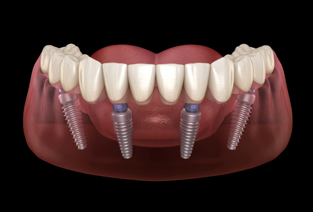 Corporate implant centers often charge $25,000–$30,000 per arch.